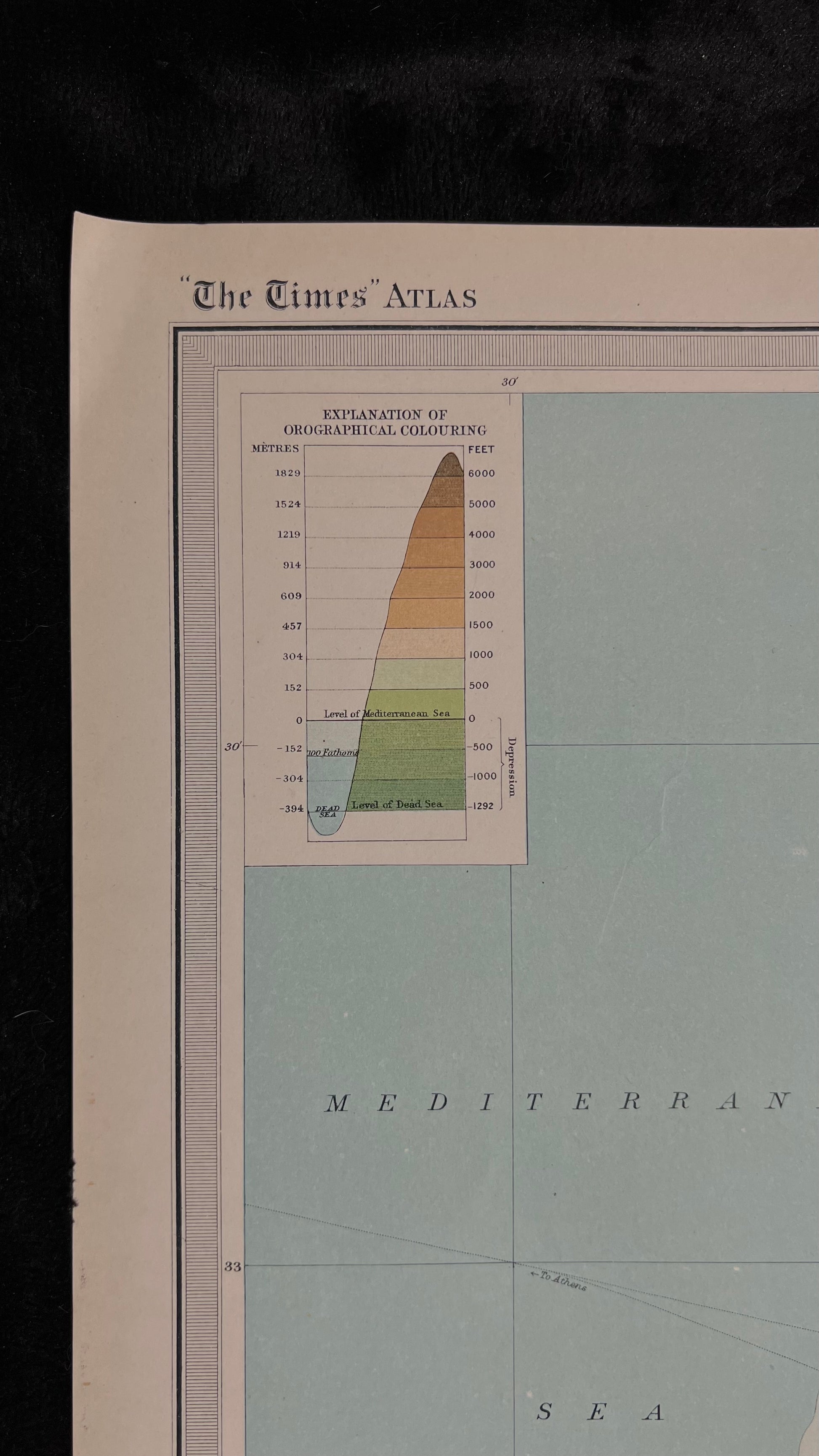 "Palestine" Large Lithograph Maps Published 1922 by The Times, London for "The Times Survey Atlas of the World" Maps by John George Bartholomew of the Edinburgh Geographical Institute. Centre fold as issued. Paper Size: 22.5 x 17.5 inch (57 x 44cm) Good Condition.