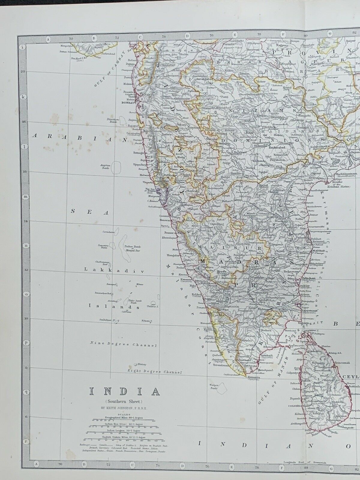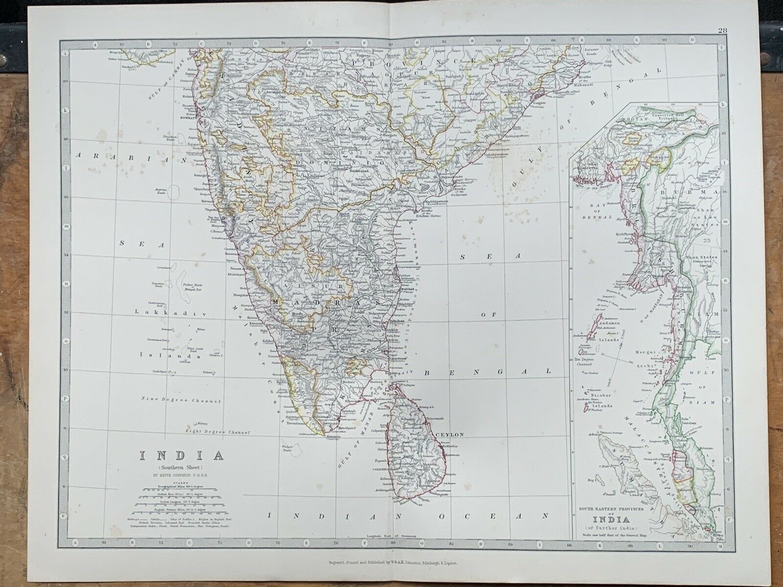 1880 South India Burma Malaya Singapore Hand Coloured Antique Map By Johnston