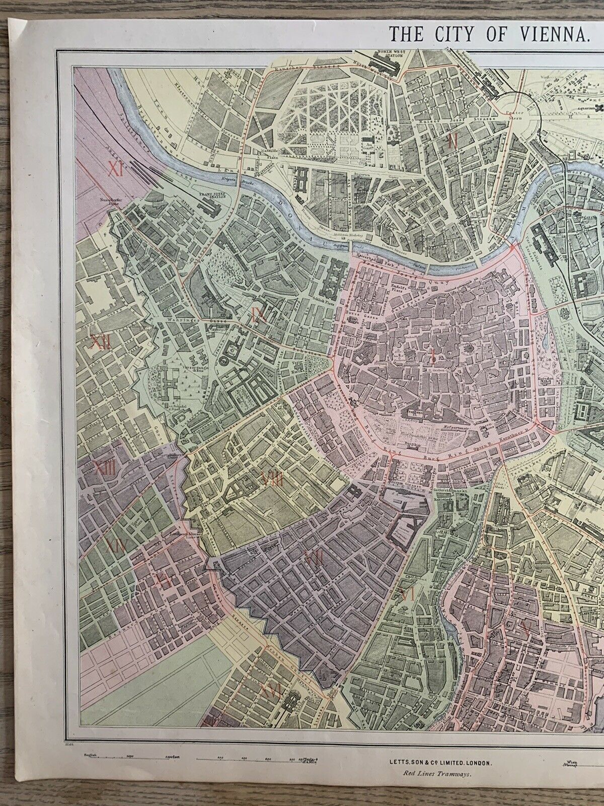 1889 Vienna City Plan Austria Original Antique Map By Letts, Son & Co.