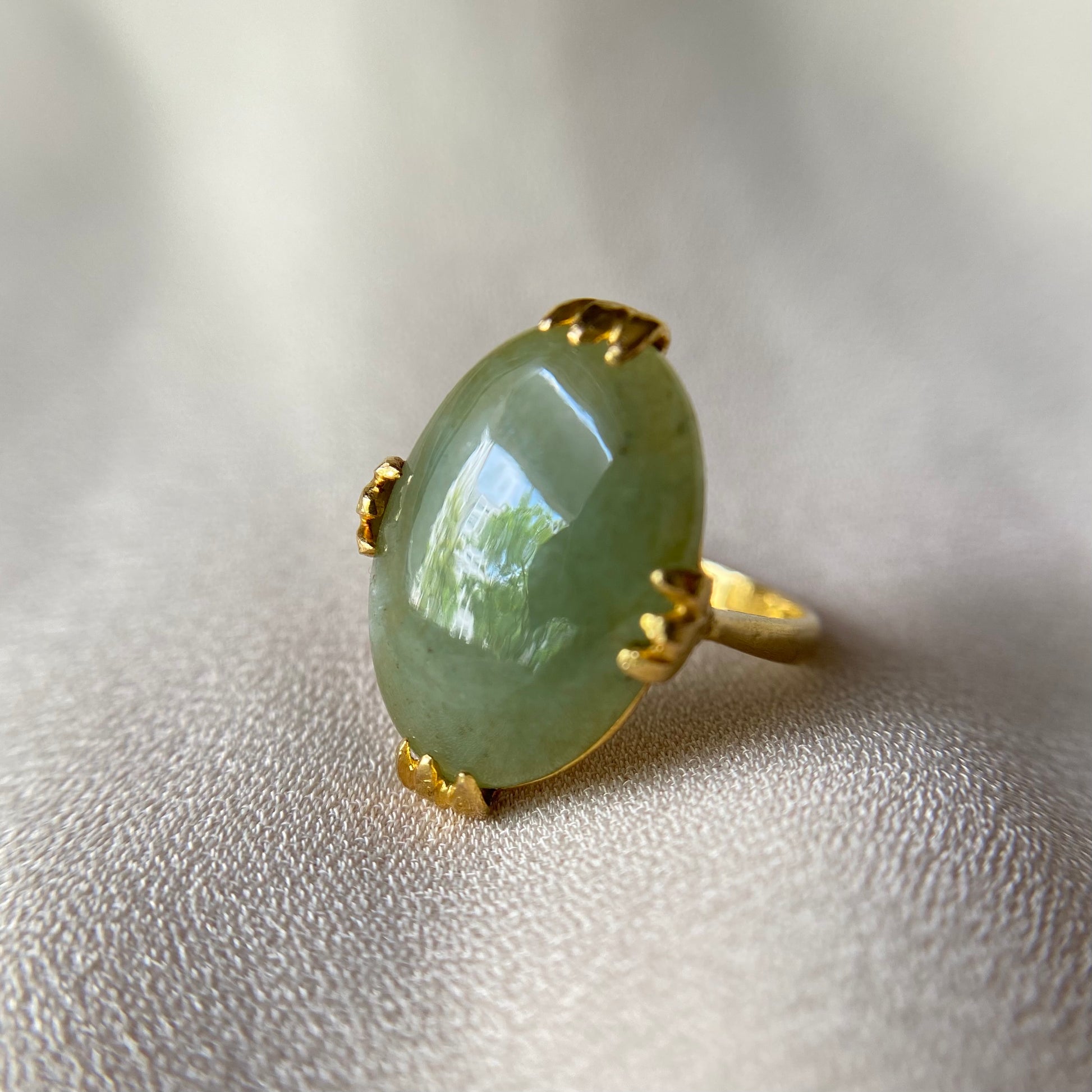Cabochon jade ring, ungraded yellow gold, width 2.2-19.5mm. Runs large.