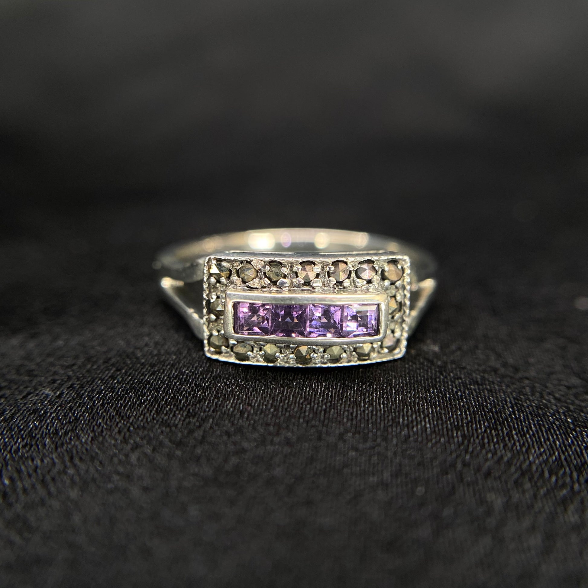 Vintage silver ring, c. 1980-90s, 925 sterling silver, 4 step cut amethyst, width 1.7-6.7mm.